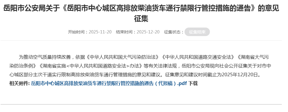 【结果展示】关于岳阳市中心城区高排放柴油货车通行禁限行管控措施的通告(代拟稿)的意见征集
