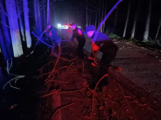 春节期间,辖区遭遇大风恶劣天气,横港派出所闻令而动,加强辖区重点路段夜间巡逻。巡逻至3号路段时,发现树木被大风刮倒横挡路面,民警立即疏导车辆、徒手清理断枝残干,快速消除安全隐患,恢复道路畅通,全力守护群众夜间出行安全。