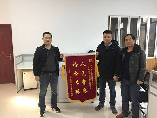 12月18日一大早,湘阴县文星镇群众张学科专程来到湘阴县局“处非”专案组在该局合成作战中心的办公室,送来一面印有“人民警察,拾金不昧”的锦旗,以感谢专案组民警曾浩然拾到其钱包物归原主。