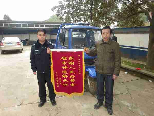 春节临近,返乡民众及车辆剧增,为了有效缓解黄沙集镇交通压力,黄沙街所每天安排1名民警、3名巡逻队员对集镇交通进行疏导。1月16日,黄沙街所民警在集镇疏导交通时,发现一台蓝色正三轮摩托车前后没有牌照,并且摩托车安装牌照位置有撬动的痕迹,民警出示证件立即对车主潘某某进行盘查,但其不能出示摩托车的有效手续。后民警依法将潘某某及车辆带至黄沙街所进一步调查,后发现该台摩托车系一辆被盗车辆,失主已经在云溪分局报案。1月17日,失主郑某为表谢意,专程请人制作了一面锦旗,亲手送到民警的手上。