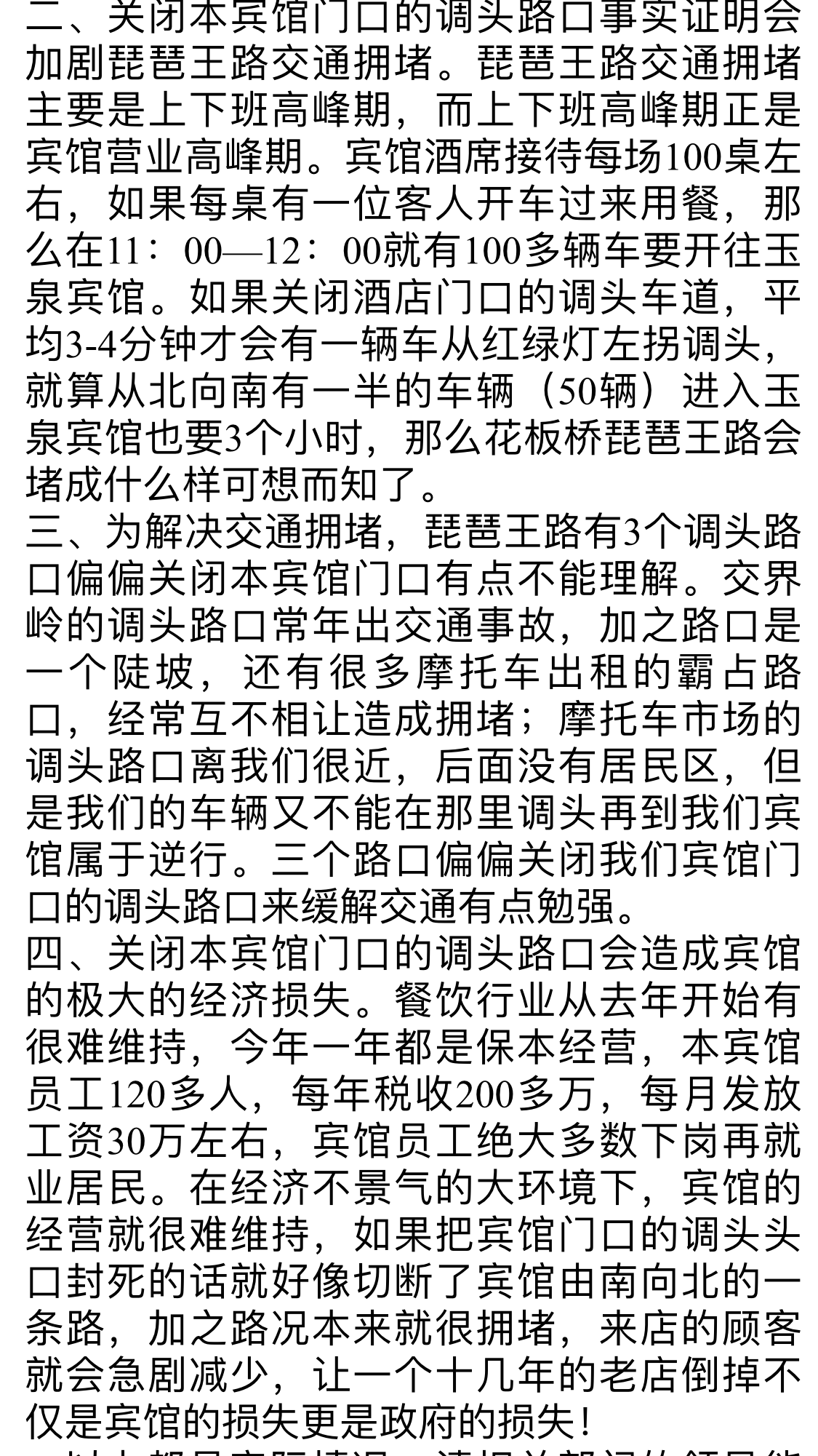 请给我们一条活路的报告 请求保留琵琶王路“玉泉宾馆”店门口掉头路口 尊敬的上级领导部门: 你们好!作为玉泉宾馆.铁山渔乡的员工,我们在这里郑重的向上级有关部门提出申请:请求保留我们宾馆门口的调头路口。玉泉宾馆建馆有15年的历史了,在成立之初琵琶王路还是比较偏僻的水泥路,马路中间也没有隔离带。随着经济的发展、城市中心的东移,花板桥也逐渐变为城市中央,琵琶王路也繁华热闹起来,马路中间护栏设立的同时为分流车流和方便周边居民,特开辟了调头路口。如今,交通部门因花板桥拥堵的问题要关闭调头路口,我们觉得不可以理解和接受,理由如下: 一、关闭本宾馆门口的调头路口并不能解决花板桥交通拥堵的问题。1、上下班交通拥堵的实质原因并不是开辟了调头路口。如今随着经济水平的提高,买车用车的人增多,上路车辆增多是交通拥堵的实质原因。2、开辟调头路口可以分流左转弯车辆,缓解交通拥堵。有很多车辆在上下班高峰期是来宾馆用餐的顾客,如果都到花板桥红绿灯左转弯放行的时候调头,那么拥堵的情况会非常严重。 二、关闭本宾馆门口的调头路口事实证明会加剧琵琶王路交通拥堵。琵琶王路交通拥堵主要是上下班高峰期,而上下班高峰期正是宾馆营业高峰期。宾馆酒席接待每场100桌左右,如果每桌有一位客人开车过来用餐,那么在11:00—12:00就有100多辆车要开往玉泉宾馆。如果关闭酒店门口的调头车道,平均3-4分钟才会有一辆车从红绿灯左拐调头,就算从北向南有一半的车辆(50辆)进入玉泉宾馆也要3个小时,那么花板桥琵琶王路会堵成什么样可想而知了。 三、为解决交通拥堵,琵琶王路有3个调头路口偏偏关闭本宾馆门口有点不能理解。交界岭的调头路口常年出交通事故,加之路口是一个陡坡,还有很多摩托车出租的霸占路口,经常互不相让造成拥堵;摩托车市场的调头路口离我们很近,后面没有居民区,但是我们的车辆又不能在那里调头再到我们宾馆属于逆行。三个路口偏偏关闭我们宾馆门口的调头路口来缓解交通有点勉强。 四、关闭本宾馆门口的调头路口会造成宾馆的极大的经济损失。餐饮行业从去年开始有很难维持,今年一年都是保本经营,本宾馆员工120多人,每年税收200多万,每月发放工资30万左右,宾馆员工绝大多数下岗再就业居民。在经济不景气的大环境下,宾馆的经营就很难维持,如果把宾馆门口的调头头口封死的话就好像切断了宾馆由南向北的一条路,加之路况本来就很拥堵,来店的顾客就会急剧减少,让一个十几年的老店倒掉不仅是宾馆的损失更是政府的损失! 以上都是实际情况,请相关部门的领导能够实地考察,听取民意,保留琵琶王路“玉泉宾馆”店门口掉头路口,不胜感激! 玉泉宾馆全体员工 2015-12-1 附:全体员工签名 请给我们一条活路的报告 请求保留琵琶王路“玉泉宾馆”店门口掉头路口 玉泉宾馆全体员工签名: