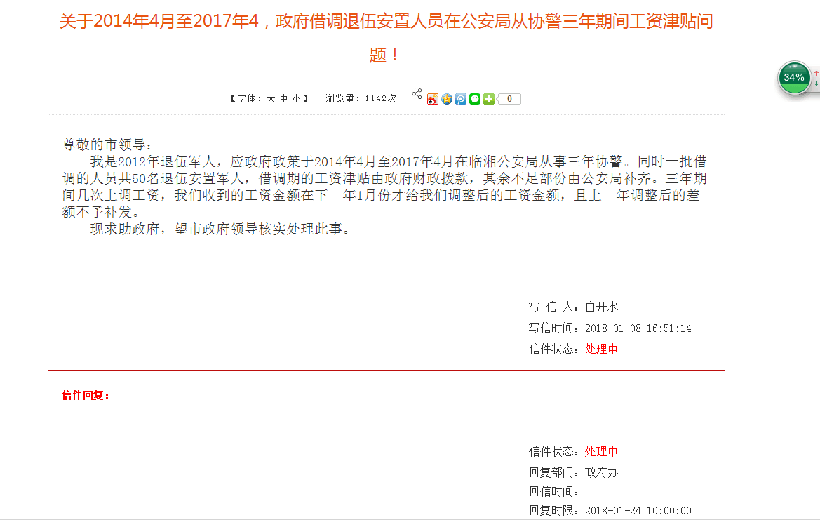 你于2018年2月9日反映,2014年4月至2017年4月,政府借调退役安置人员在公安从事三年协警期间的工资津贴未落实到位的问题。