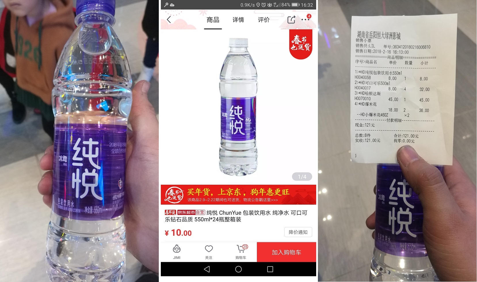 本人与2018年2月15日(正月初一)到位于高铁站附近的恒大绿洲影院看电影,因周边没有商超开门,只能在电影院内购买饮料。电影院的饮品高于一般市场零售价是常态,比如500ml装可乐、芬达等,一般超市大约3-4元一瓶,影院翻倍卖到8元一瓶,这个我也能理解,但是这里销售的最基础的纯净水,也就是可口可乐冰露纯悦550ml装,市场价1-1.5元,一般批发价0.8-0.9元/瓶,网店促销售价甚至低于0.5元/瓶,这里却也要卖到8元一瓶!至少翻了8-10倍!!这真的合理麽??
