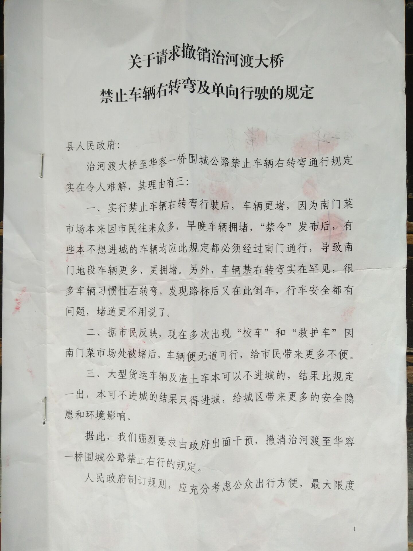 据此,我们强力要求由政府出面干预,撤销华容县治河渡大桥至华容一桥围城公路禁止右行的规定。