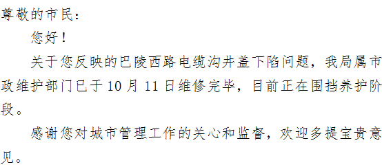电缆沟维修,是十月八号提的,今天早上晨练经过该路段,发现维修工作已经开始了。岳阳城管这种工作态度和为人民办实事的精神,值得大力宣传和学习。