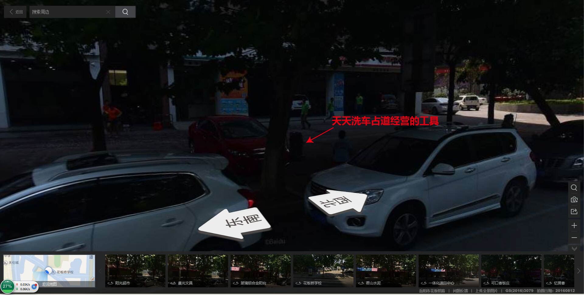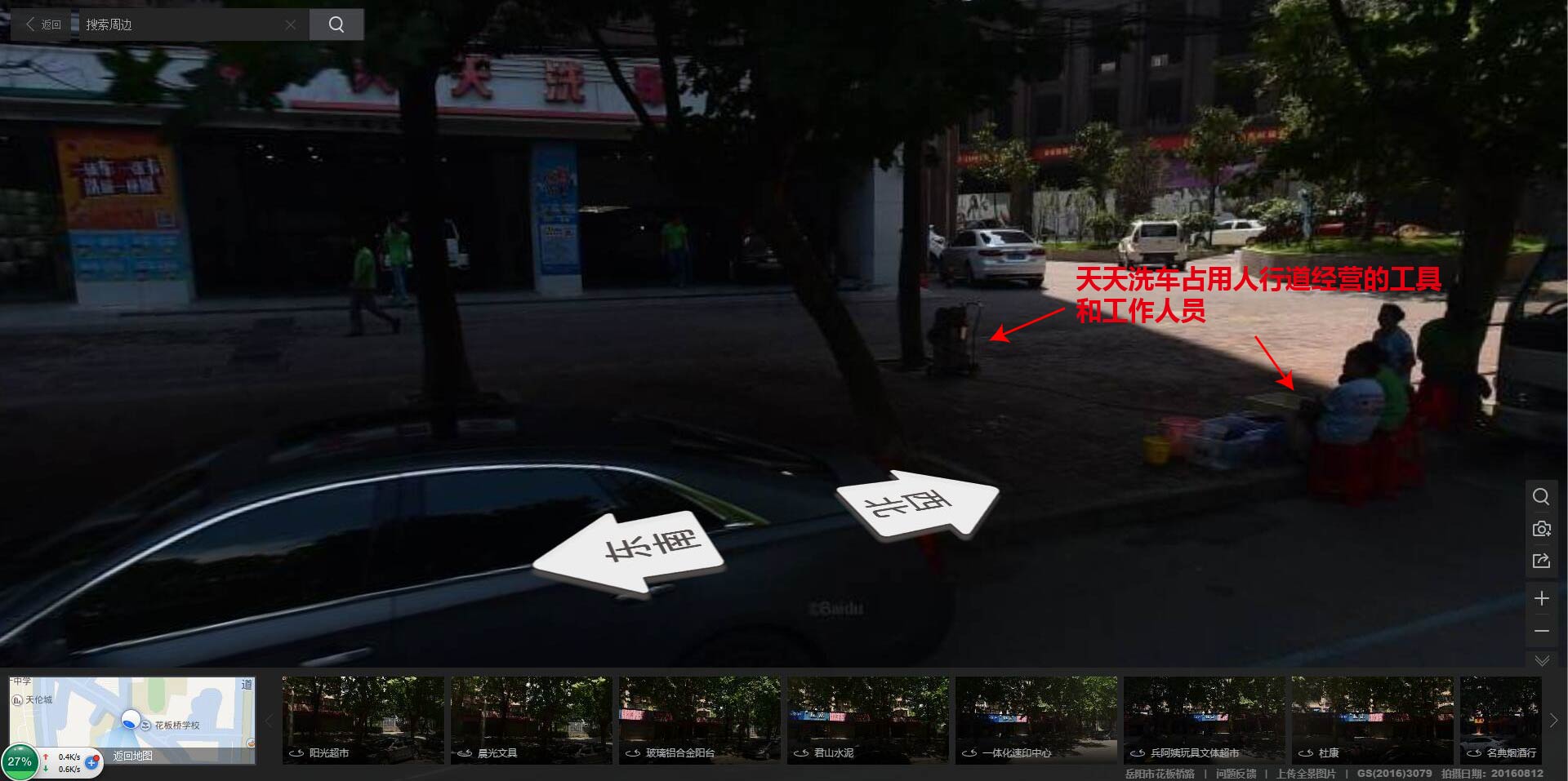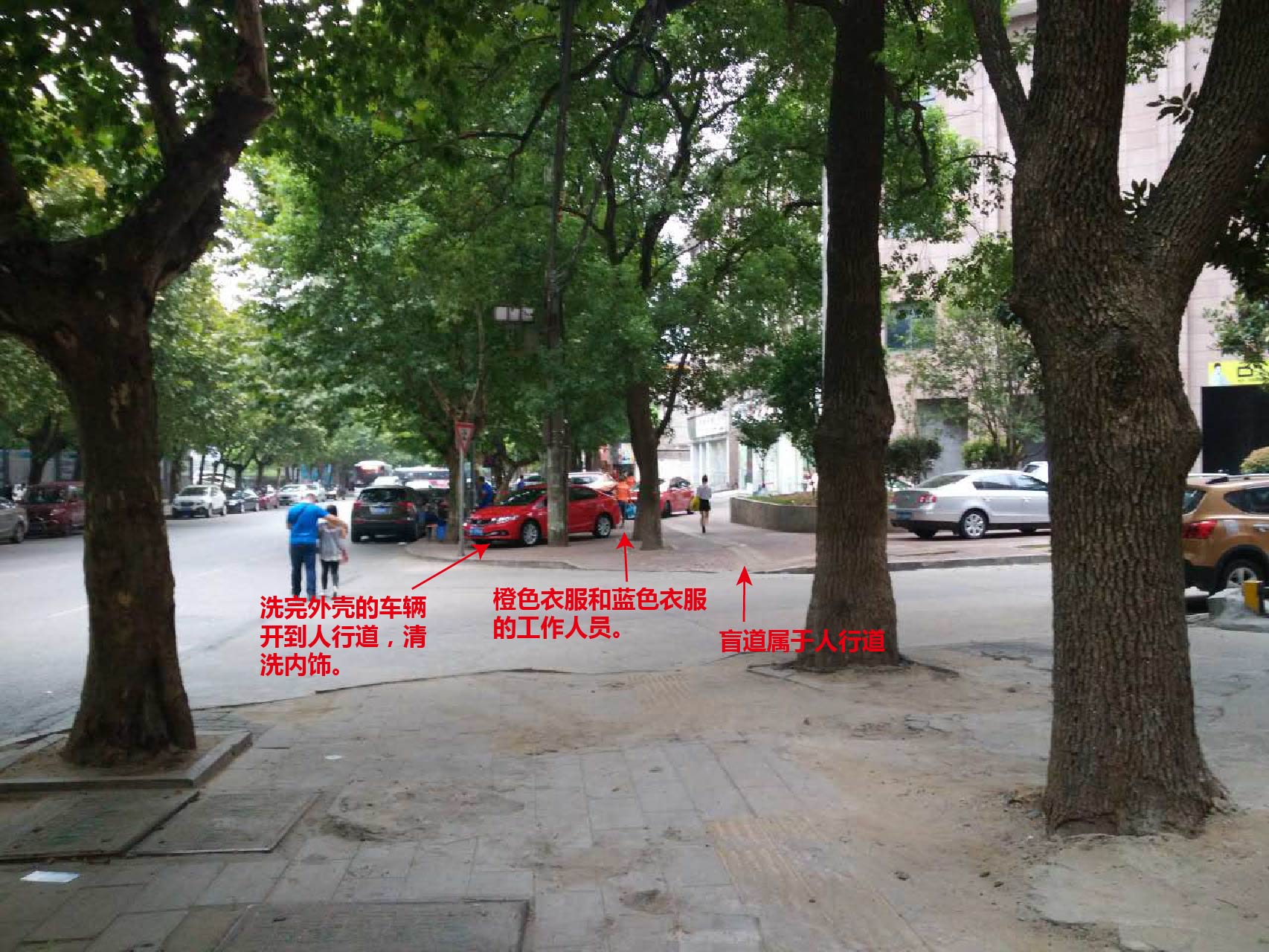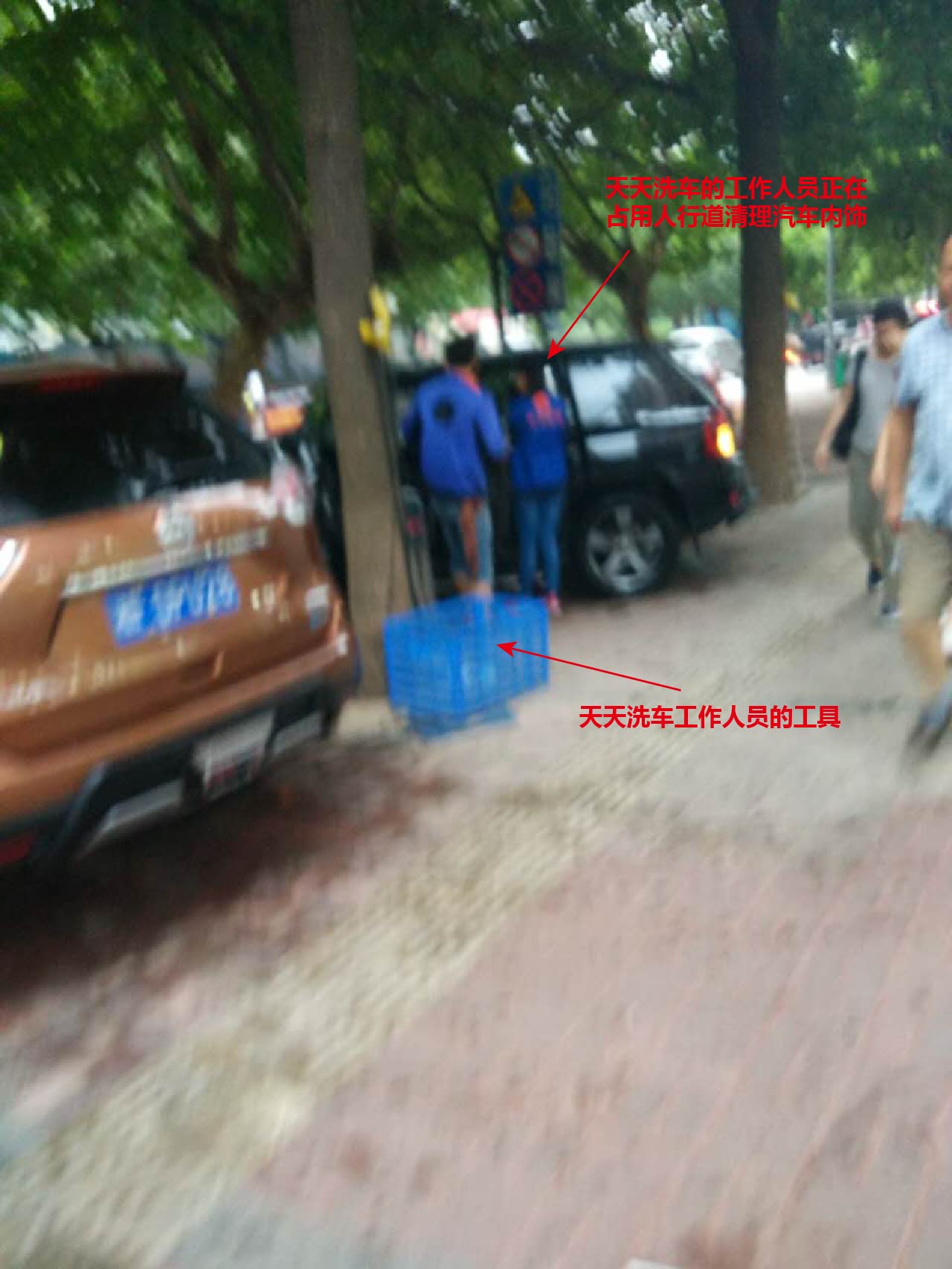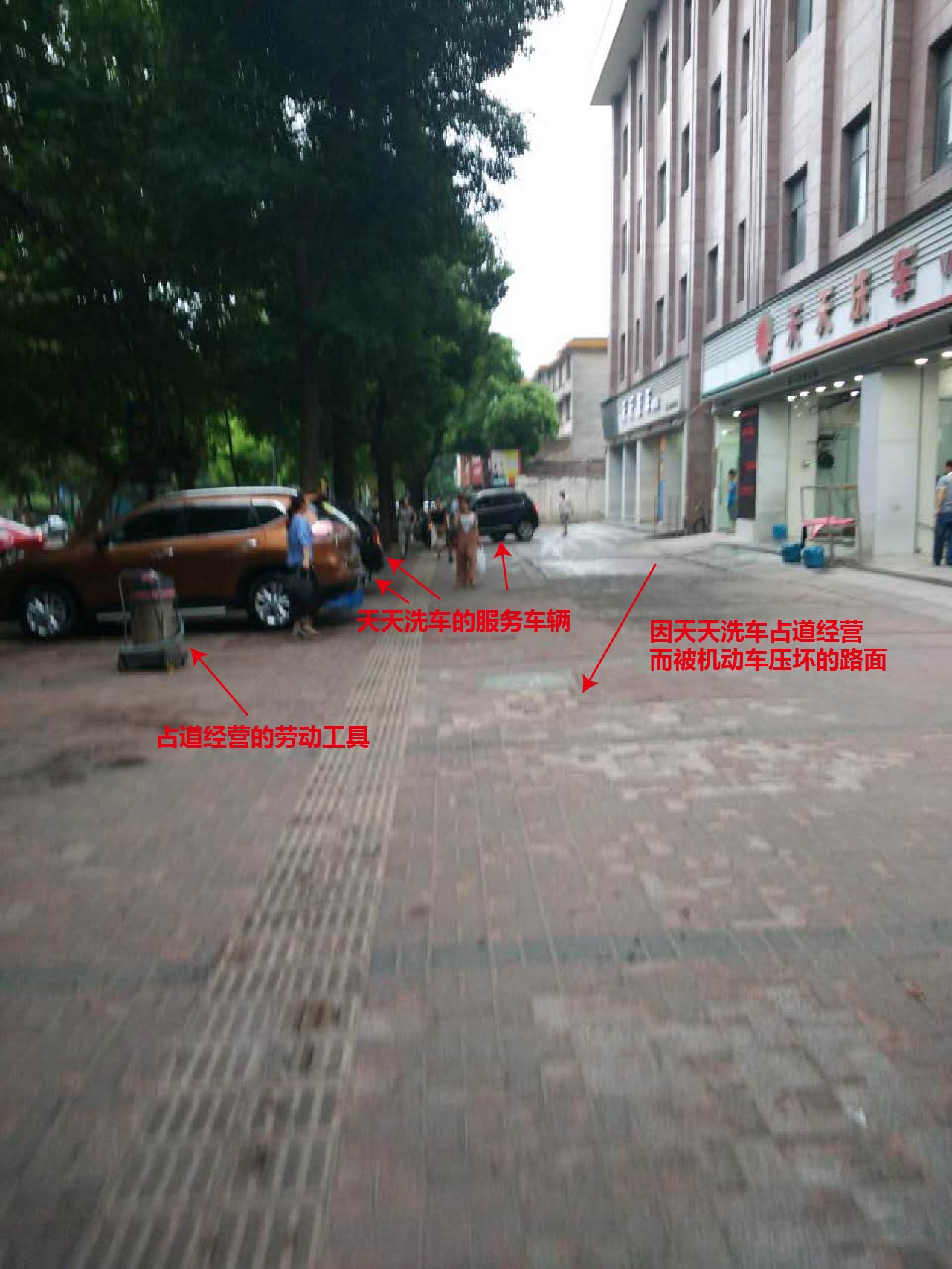 天天洗车占道经营,服务车辆压坏人行道。