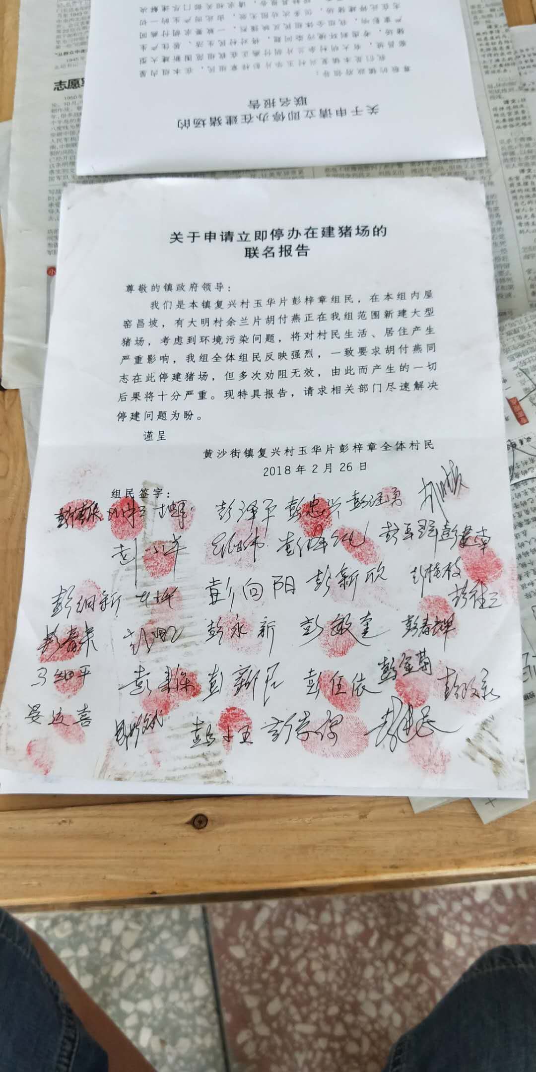 兹有余兰村村民胡付燕在黄沙街玉华村二组居民居住处上游三、四百米处违法私自建设猪场,不顾全体村民反对,强行铲山头八亩多,极大的破坏我村环境及地貌,给我村居民带来了极大的环境污染问题,希望相关单位给我村全体居民做主,还我村民良好的生活环境。现有反对村民联名请愿书,望相关单位予以重视。