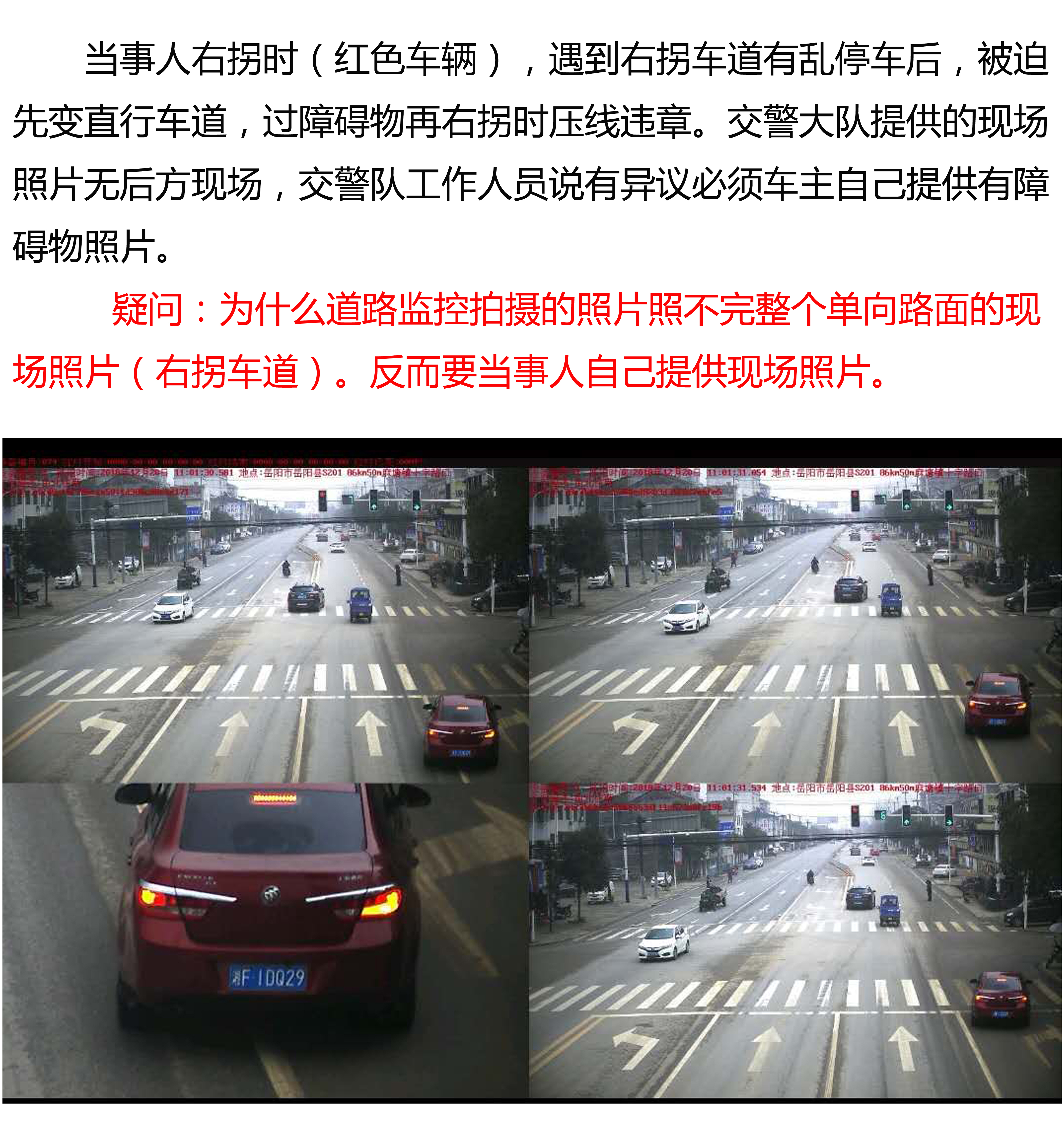当事人车辆在岳阳县麻塘十字路口处右拐弯时压白实线了,但现场交通违章照片为什么拍不全当时整个单向的路面(右拐弯道有障碍物)。岳阳县交警队工作人员解释说十字路电子拍摄照片的系统是这样设置的,不是我一个人的是这样,但如果车主有异议的话必须自己提供现场有障碍物的照片才能算被迫违章。 质疑: 1、车主当时不可能先停车拍照后再压线变道违章(这给交通安全带来很大的隐患)。 2、是不是系统故意这么设置现场照片的范围(不拍完整整个路面不留关键的证据),再随便罚款普通老百姓。 3.15就要到了,请相关领导明查,老百姓一直在线等待。 附件1:现场照片0.jpg |