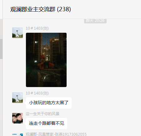尊敬的县长,您好! 岳阳县观澜郡小区一期2020年12月31日顺利交房,小区业主心中满是欢喜。入住小区后发现小区夜间照明严重达不到(城市夜景照明设计规范JGJ_T163-2008-5.4规范要求,见附表),多次和物业反映无果。希望领导莅临考察,解决小区内部夜间照明问题,增设照明灯具。 附件1:小区业主反映.png 附件2:夜间现场照明.jpg 附件3:照明规范值.jpg |
