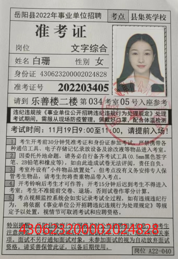 你好,我想申请成绩复核,我报考的岗位是A22,名字是白珊,准考证号是202203405。 |