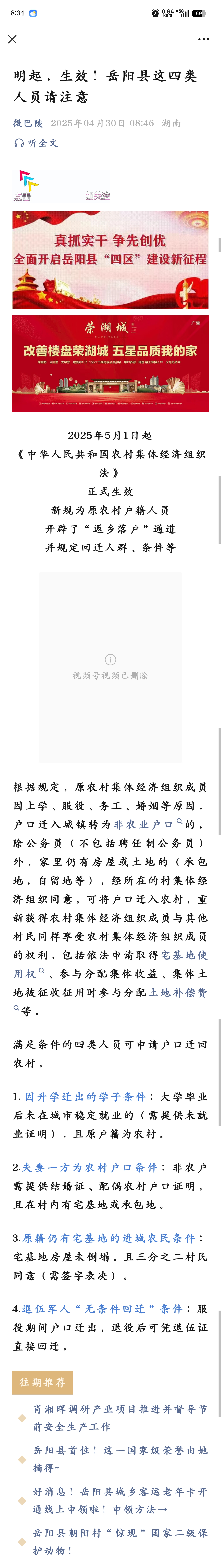 2025年9月15日,我咨询关于户口迁回。当天,柏祥镇派出所工作人员回复说没有收到上级通知,不能迁回。我问2025年4月30日微巴陵公众号上发布:“2025年5月1日起《中华人民共和国农村集体经济组织法》正式生效,根据规定,原农村集体经济组织成员因上学、服役、务工、婚姻等原因,户口迁入城镇转为非农业户口的,除公务员(不包括聘任制公务员)外,家里仍有房屋或土地的(承包地,自留地等),经所在的村集体经济组织同意,可将户口迁入农村,重新获得农村集体经济组织成员与其他村民同样享受农村集体经济组织成员的权利,包括依法申请取得宅基地使用权、参与分配集体收益、集体土地被征收征用时参与分配土地补偿费等。满足条件的四类人员可申请户口迁回农村。4.退伍军人“无条件回迁”条件:服役期间户口迁出,退役后可凭退伍证直接回迁。”柏祥镇派出所工作人员还是回答,没有收到上级通知。我想问,微巴陵是不是岳阳县政府微信公众号,上面发布的文件是不是有效的。 根据《中华人民共和国农村集体经济组织法》第十七条 有下列情形之一的,丧失农村集体经济组织成员身份: (一)死亡; (二)丧失中华人民共和国国籍; (三)已经取得其他农村集体经济组织成员身份; (四)已经成为公务员,但是聘任制公务员除外; (五)法律法规和农村集体经济组织章程规定的其他情形。 因前款第三项、第四项情形而丧失农村集体经济组织成员身份的,依照法律法规、国家有关规定和农村集体经济组织章程,经与农村集体经济组织协商,可以在一定期限内保留其已经享有的相关权益。 第十八条 农村集体经济组织成员不因就学、服役、务工、经商、离婚、丧偶、服刑等原因而丧失农村集体经济组织成员身份。 我的诉求是,如果我的户口不能迁回,请给我说明哪个法律规定了不能迁回,而不是只会回答没有收到上级通知;同时,请不要柏祥镇派出所工作人员回复我。 附件1:微巴陵发布内容.jpg |